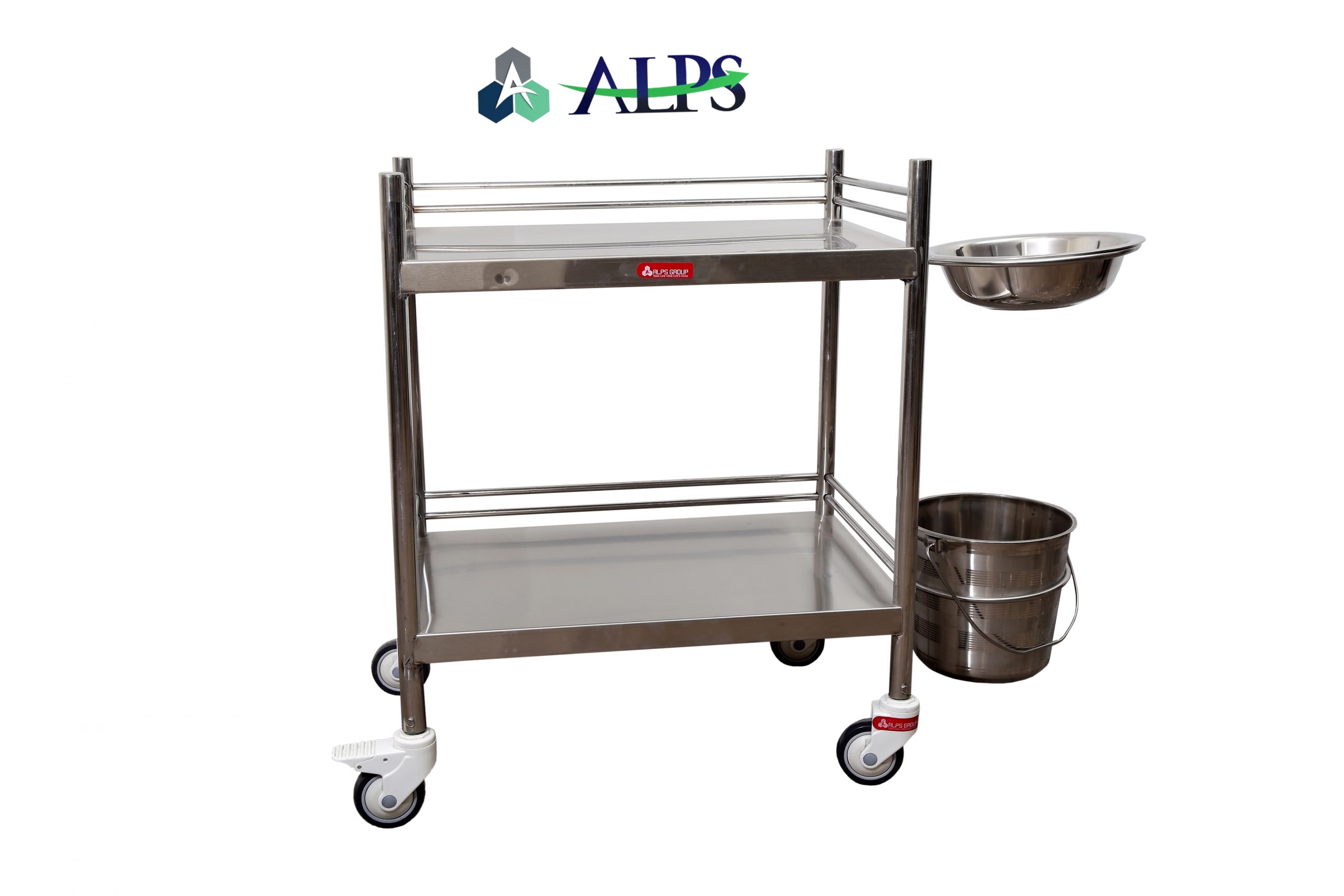 A 3-side 10 mm solid rod railing ensures safe handling of items during movement. The trolley is equipped with two stainless steel buckets for convenient use. Smooth mobility is ensured with 125 mm TPR castors (2 swivel and 2 with brake). Supplied as a ready-to-use unit, it is ideal for daily dressing and medical procedures.